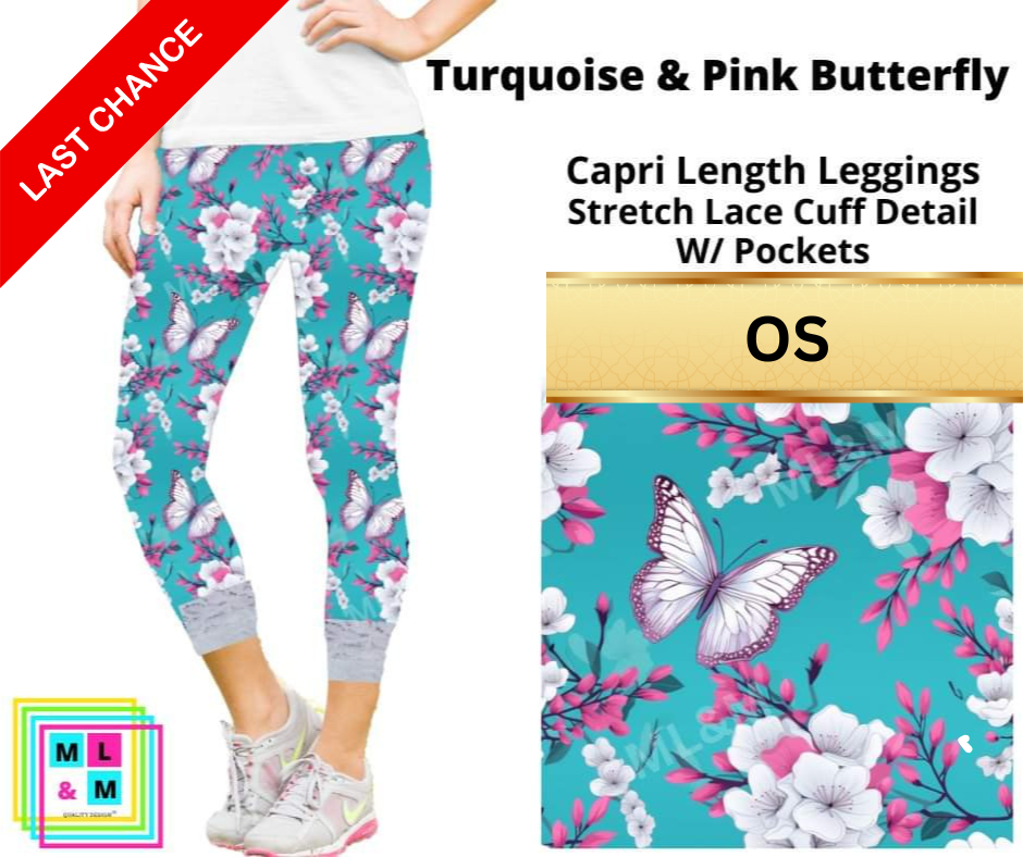 Turquoise & Pink Butterfly Lace Cuff Capris w/ Pockets