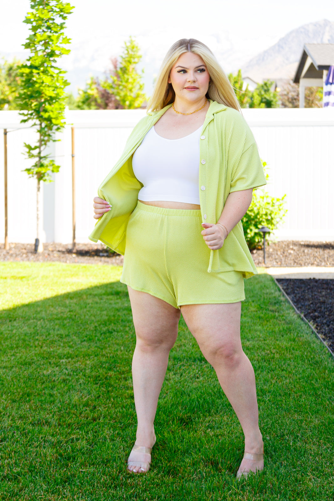 Light up the room in Two’s Company Ribbed Button Down. The textured ribbed knit elevates any look with a unique drop shoulder and collared design. Create an effortless set when paired with the matching shorts--you'll be sure to have all eyes on you. Turn heads in effortless, stylish comfort.