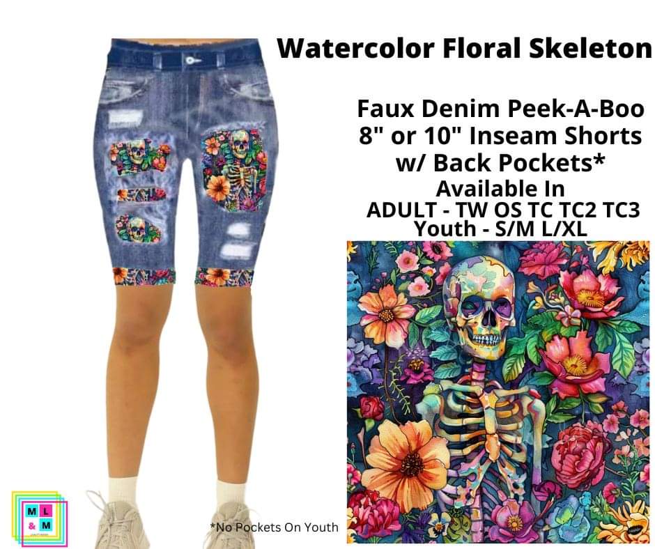 Watercolor Floral Skeleton Faux Denim Shorts w/ Back Pockets