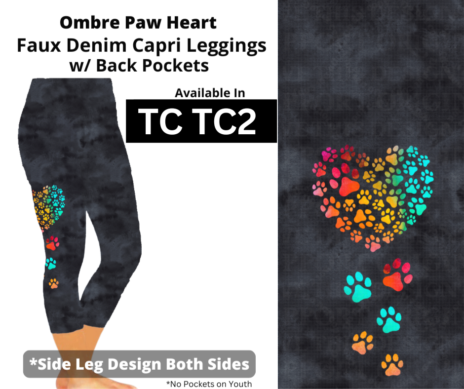 Watercolor Ombre Paw Heart Capri Leggings w/ Side Leg Designs